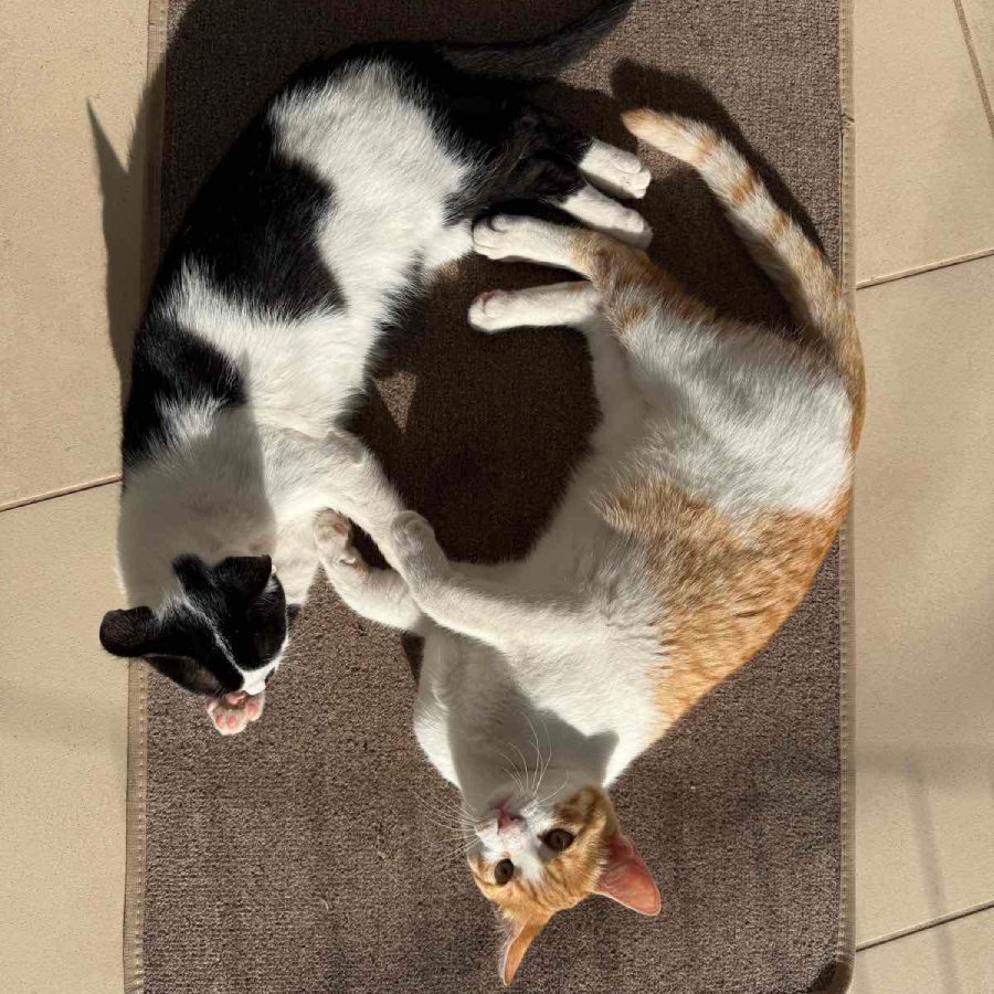Τα δύο παιχνιδιάρικα γατάκια φιλοξενήθηκαν από εθελοντή μας ενώ ήταν πολύ μωρά ακόμη. Η μαμά τους σκοτώθηκε στην Νέα Επίδαυρο και αυτά βρέθηκαν εντελώς μόνα σε μία ηλικία που δεν υπηρχε περιπτωση να επιβιώσουν. Ευτυχώς βρέθηκε οικογένεια σε κοντινή περιοχή να τα υιοθετήσει και τα δυο μαζί. Σήμερα ζουν ευτυχισμένα στο σπιτάκι τους!